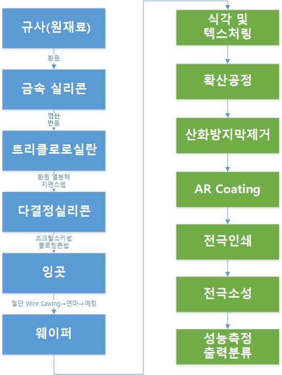 | 2 | 안정화 된 기본기술 | 반도체 웨이퍼 제조공정과 동일한 과정으로 생산이 되므로 반도체 기술과 함게 공정이 발전해 옴 |