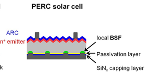 단결정 실리콘 태양전지 구조는 pn접합인데, 이면측에 고농도 도핑을 하여 BSF층을 형성하여 전자의 수집효율을 개선한 셀의 형태가 된다. 이 구조를 BSF(Back Surface Field)형 셀이라고 한다. 아래의 그림은 전극부분에 BSF를 형성한 Local BSF층을 형성한 셀의 단면구조를 보여주고 있다, 시장에서는 PERC셀 이라는 말로 불리운다.